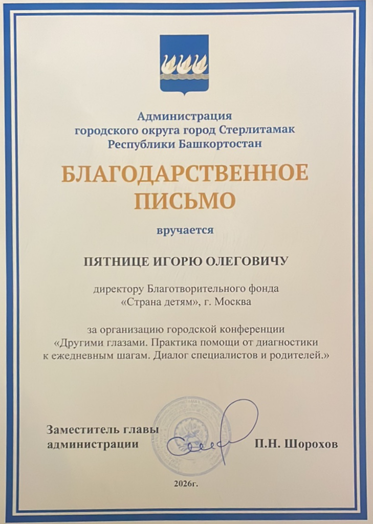 Отдельным приятным итогом конференции для нашего фонда стало благодарственное письмо от администрации Стерлитамака «за организацию городской конференции».